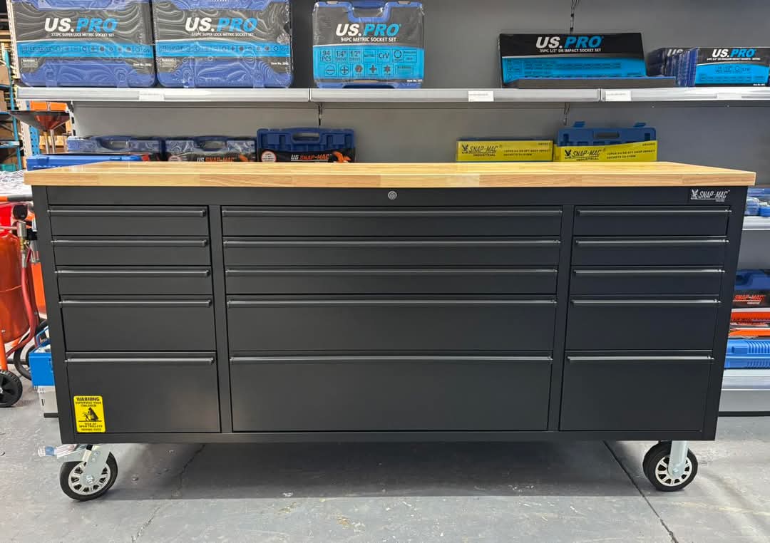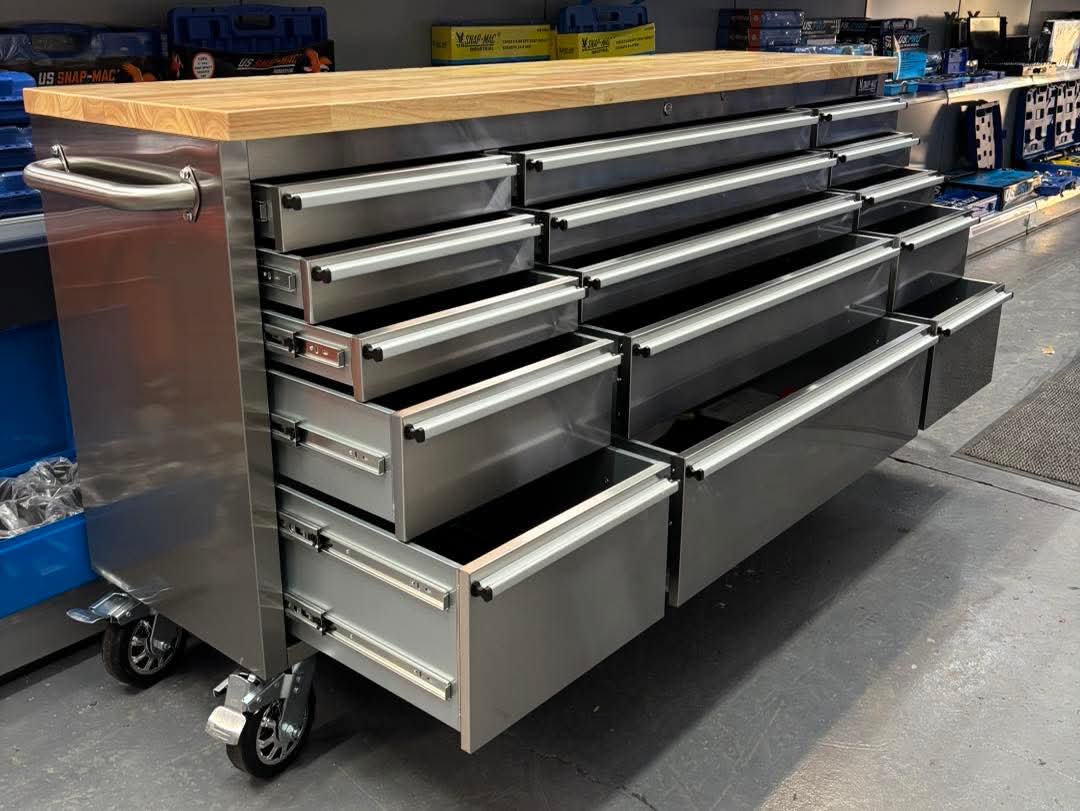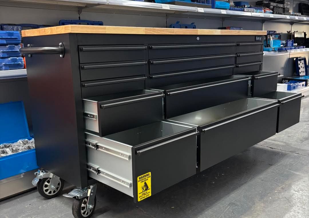 Rugged 46-inch mobile tool chest with nine ball-bearing drawers, solid wood worktop, and locking system — professional garage storage at an accessible €550.